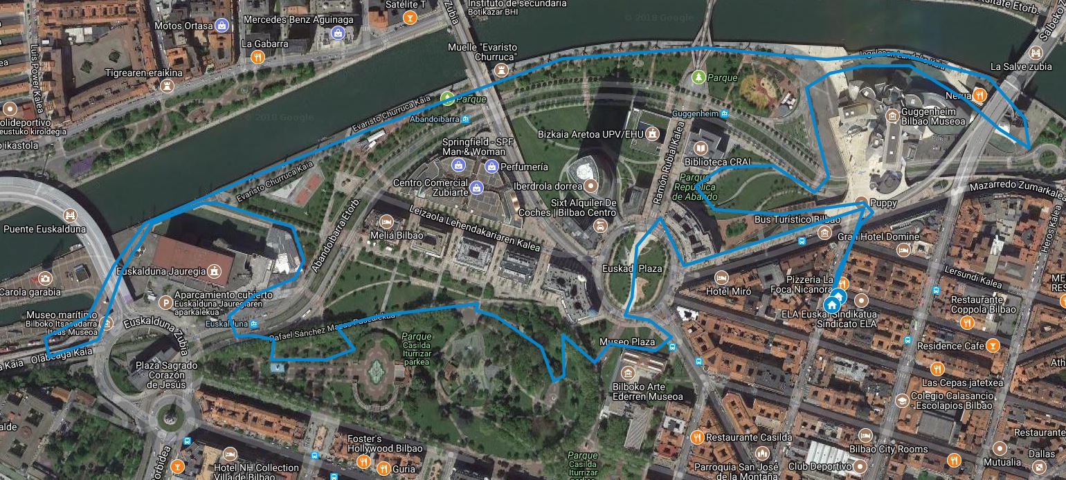 Su primera visita es al Cachorro, el famoso perro guardián del Guggenheim, cruzará la plaza Euskadi para encontrarse con el museo de bellas artes. Desde aquí, se entra al parque de Doña Casilda, el pulmón de Bilbao, para llegar al palacio Euskalduna, que se bordeará para llegar al museo marítimo y la famosa grúa Carola, símbolo del pasado industrial de la ciudad de Bilbao.