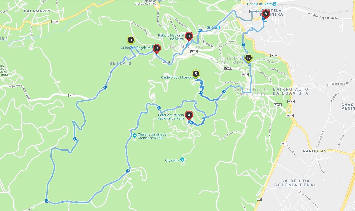 Luego recorrerá 1,67 millas alrededor de Sintra en Rua Boca de Bogage a través de un hermoso paisaje. El mapa incluirá un punto de vista para admirar Sintra desde arriba de las colinas. Después de eso, irás al Palacio Nacional da Pena, un hermoso y colorido palacio que también puedes explorar adentro.