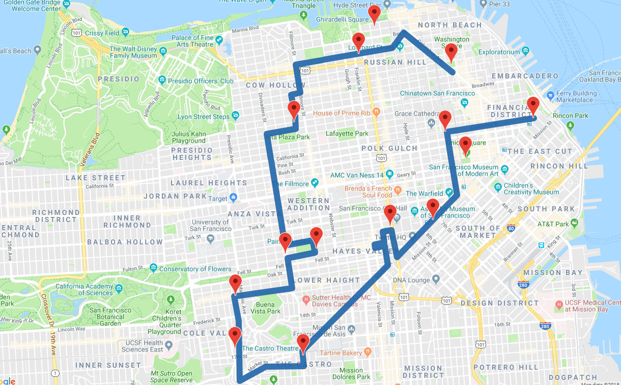 Dé un paseo por Davies Symphony Hall de camino a nuestro descanso de la mañana en Hayes Valley, un barrio de lujo conocido por su increíble comida, moda y arte. Desde allí, vamos en metro, en el metro de Muni, hacia el famoso distrito de la Misión. Muchos consideran que la Misión es el corazón y el alma cultural de la ciudad, después de explorar la rica y colorida historia y estética de este vecindario, nos dirigimos al famoso Distrito de Castro, donde abundan los colores del arcoíris.