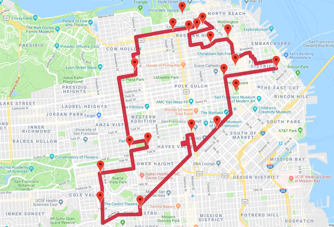 Desde allí, vamos en metro, en el metro de Muni al famoso distrito de Castro, donde abundan los colores del arcoíris. desde el Castro continuaremos por las calles de superficie, utilizando una de las líneas de autobús más pintorescas de la ciudad para llegar a Haight Ashbury y luego, después de un breve paseo, llegar a las World Famous Painted Ladies en Alamo Square y el distrito de Napa.