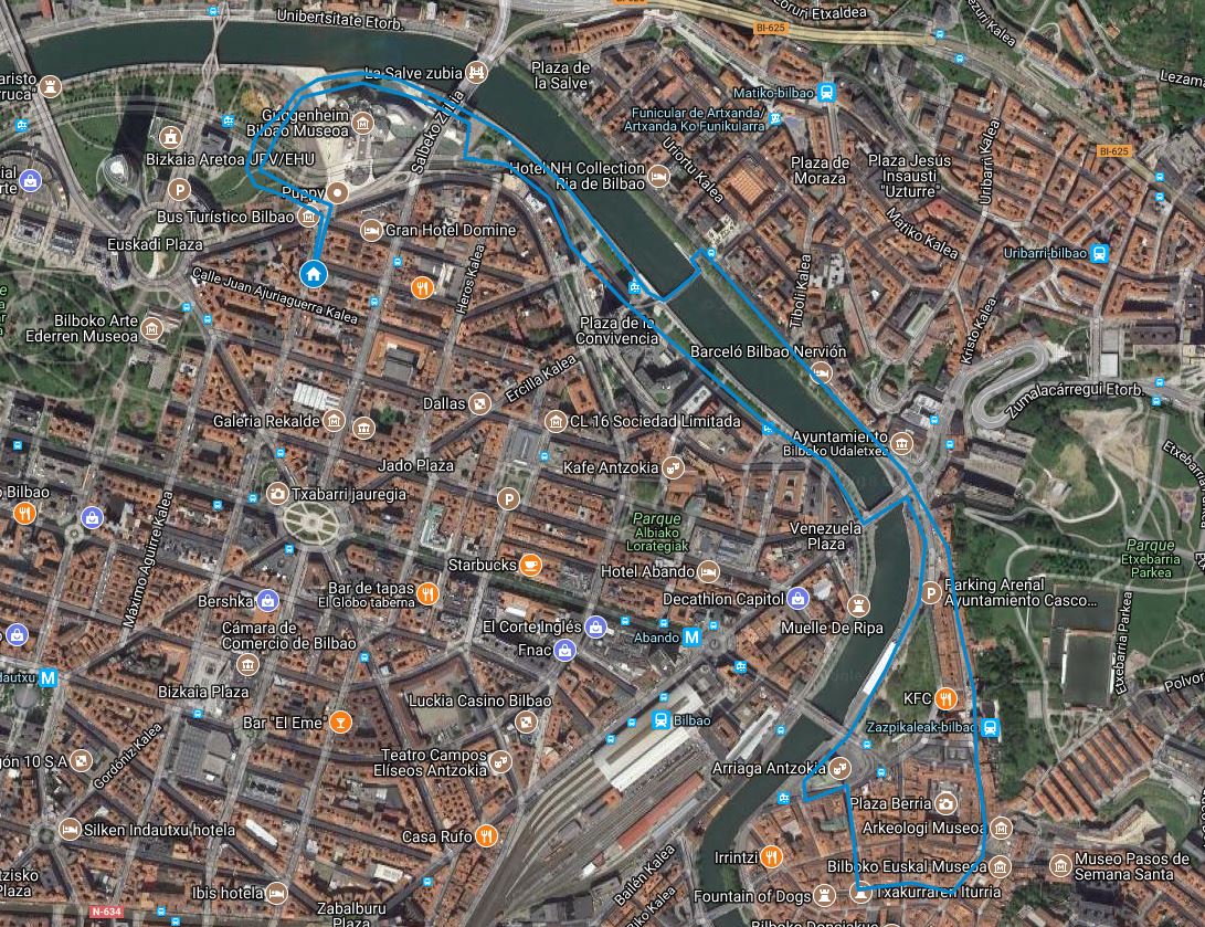Then you will cross it to continue through the volantín field walk until you reach the city hall of Bilbao, and through El Arenal park you will enter the old town on the way to the cathedral of Santiago, visiting the Plaza de Unamuno and the new square.