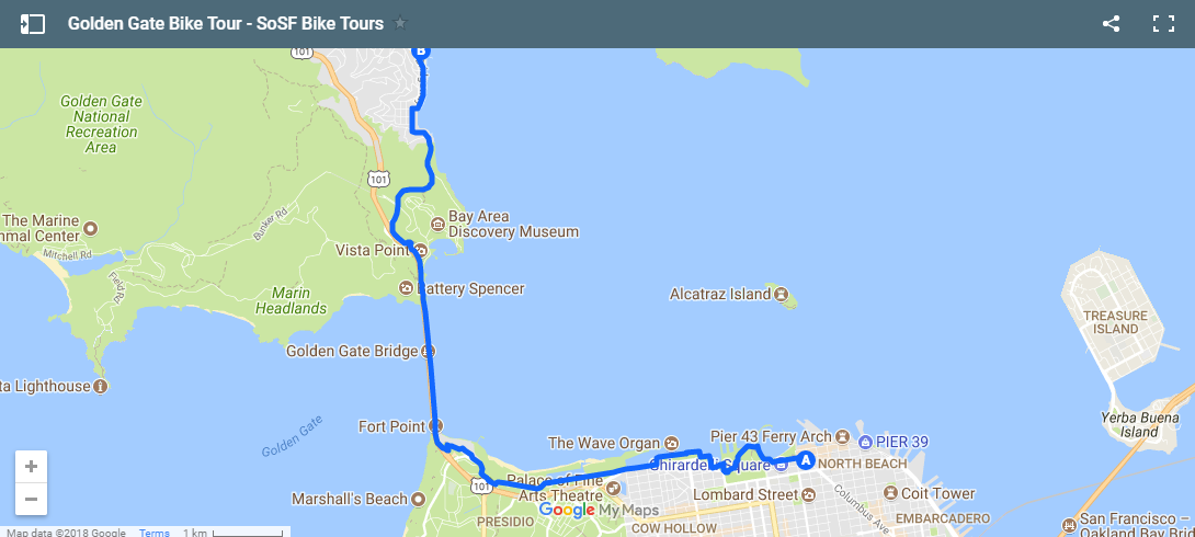 When you are back The Blue and Gold Fleet ferry disembarks in Fisherman’s Wharf, about 5 minutes from our starting location. Here you will be able to use the bikes to explore the rest of the day; bikes just need to be back at the shop before closing time.