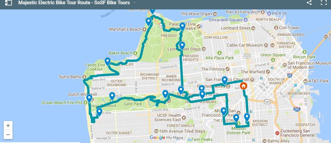 This E bike tour of 6 hours starts at our shop at Hayes Valley a local’s favorite with boutique shops, cafes, and a busy park on sunny days. Your guide will lead you to visit the neighborhoods and parks we love but aren’t easily accessible on ordinary bikes, E bikes have plenty of power and battery capacity to propel us through all the places. You will also get the best views of the Golden Gate Bridge. This tour finishes at our shop in Hayes Valley.
